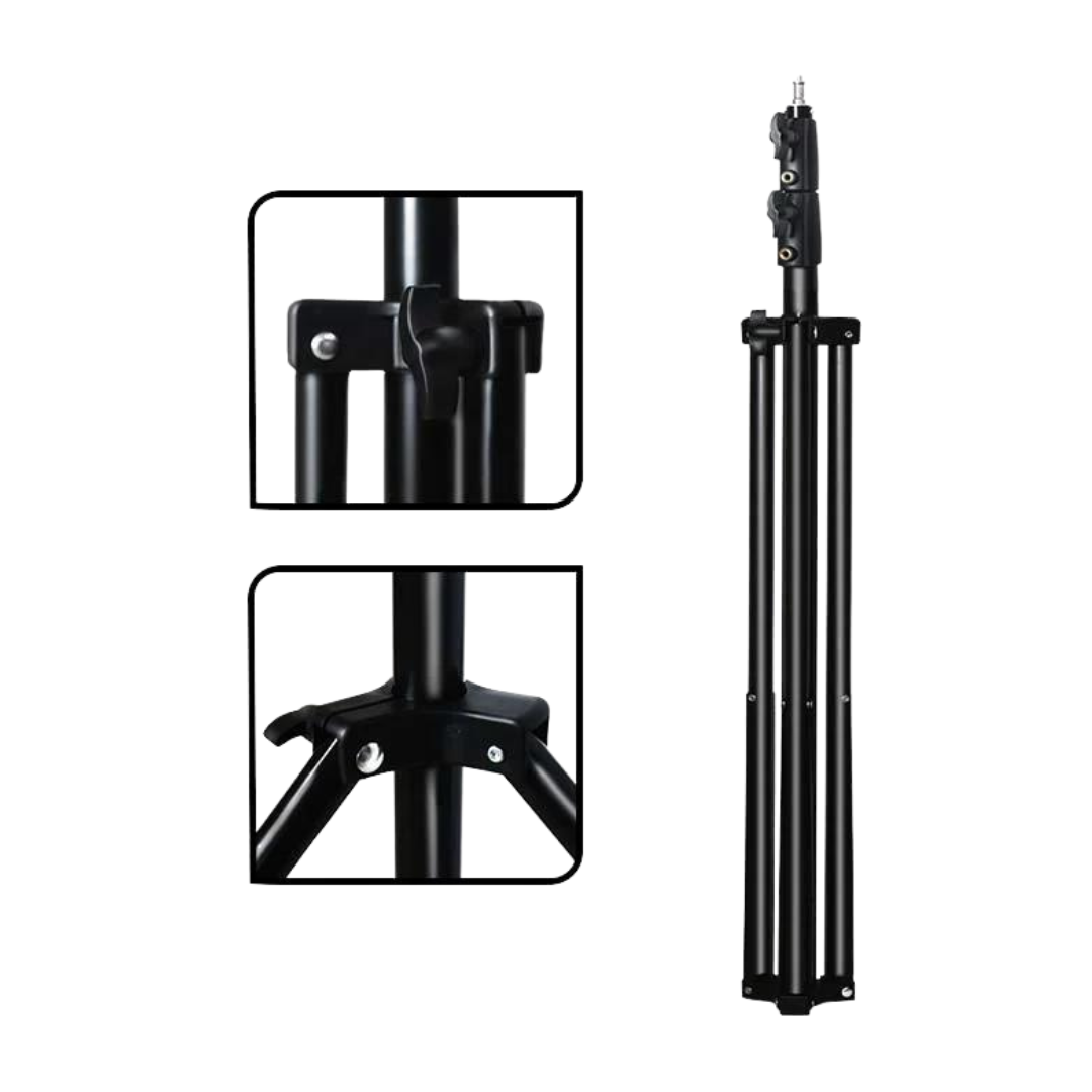 The photo tripod is made of aluminum with a total weight of 1600 grams. The maximum load capacity is 5 kilograms. With a footprint up to 108 cm, the tripod light stand is extra stable – even with the center column fully extended and on uneven terrain.
