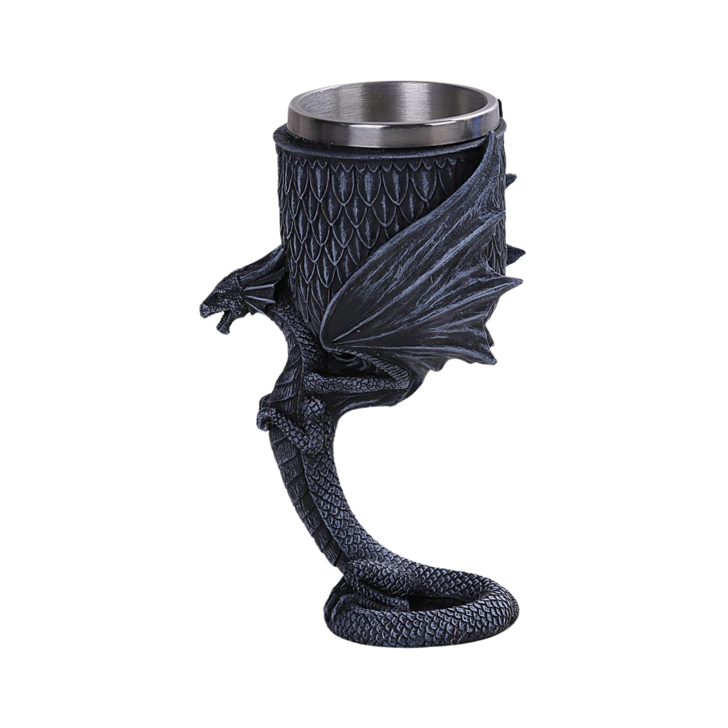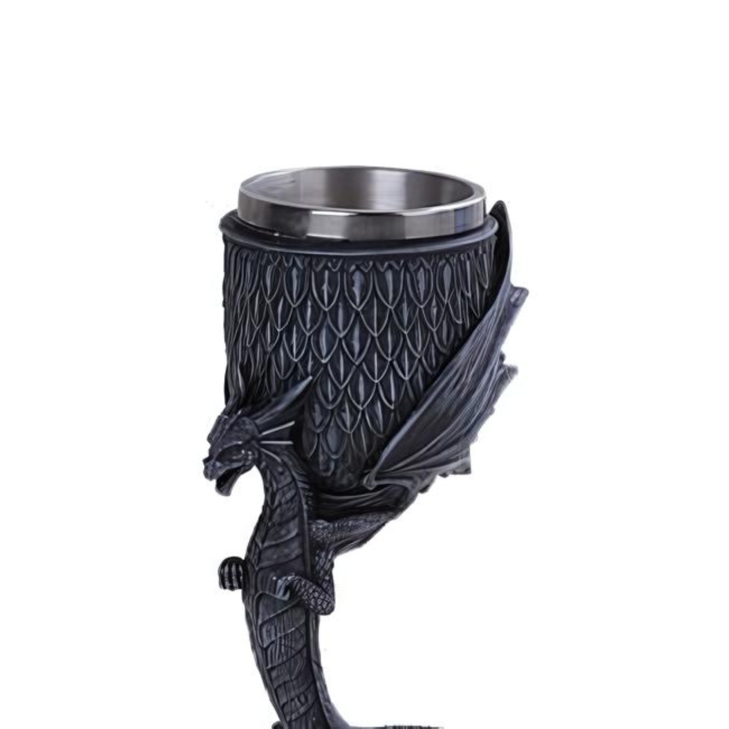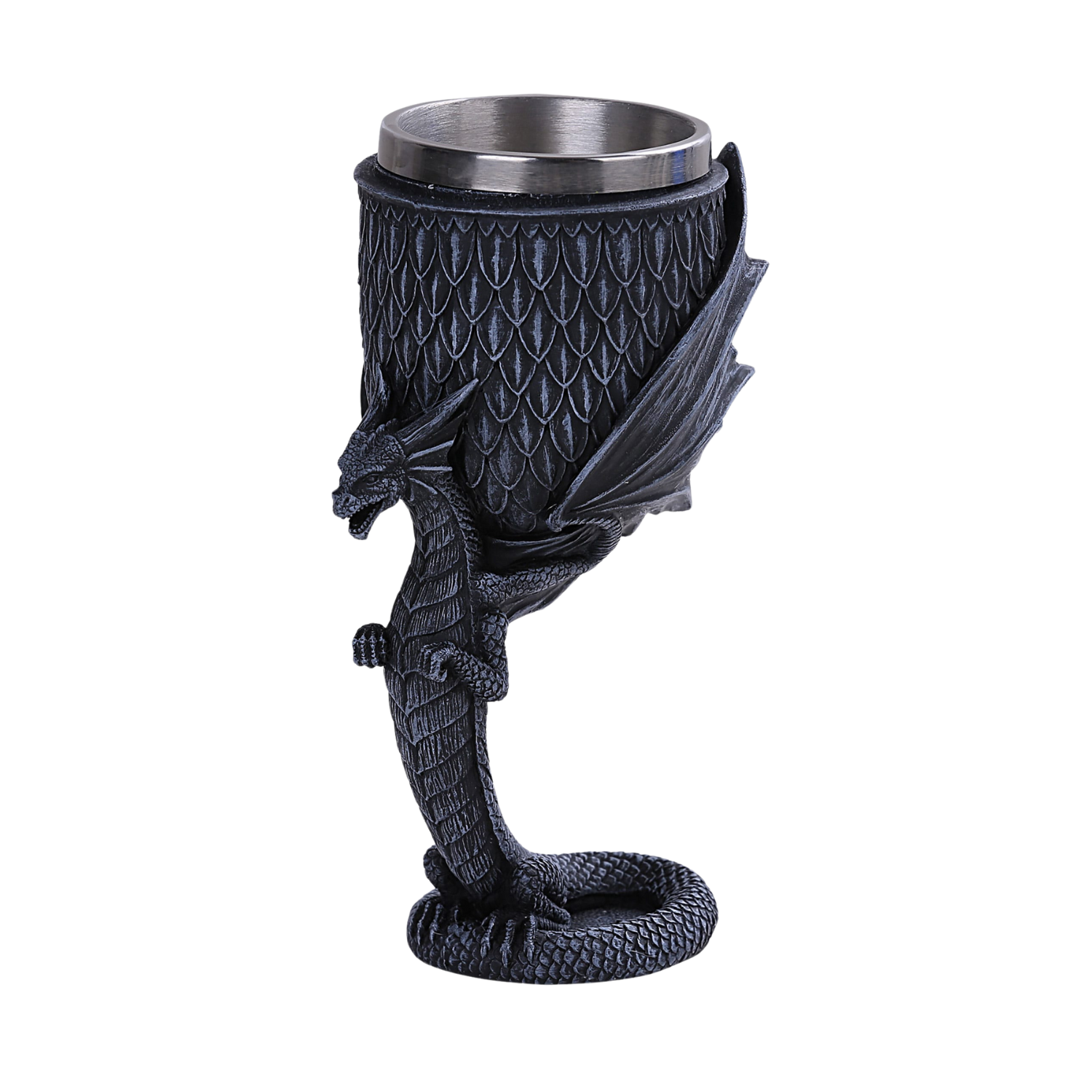 Drink deeply of a rich Fantasy world with this enchanting Dragon Goblet. The highest-quality resin has been cast and hand-painted into an onyx Dragon on the cup, jealously guarding your precious drink. With a removable stainless steel insert for ease of cleaning, this Goblet makes a mysterious and enticing addition to any studio or home. Perfect for decoration or as a gift.