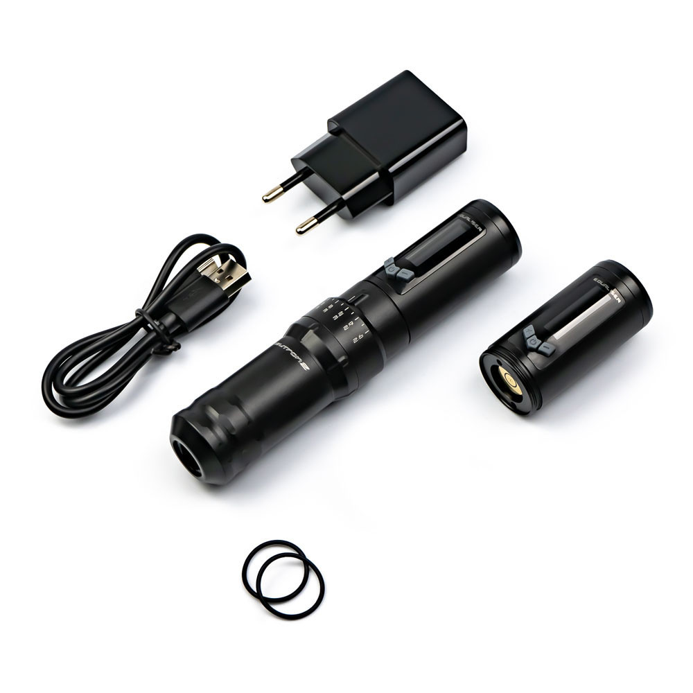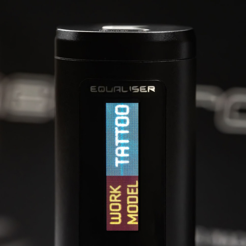 Discover Kwadron’s latest innovation, Equaliser Neutron2. The successor to the renowned Neutron model, which gained worldwide recognition among artists for its reliability and functionality, now takes everything to an even higher level. Equipped with a crystal clear color display that allows for saving your voltage settings, setting session timers and even changing between SMP or Tattoo work mode. The display orientation can be flipped for right-handed or left-handed users. The Neutron2 comes with adjustable stroke, giving you full flexibility. The set includes two batteries with convenient buttons for up to 10 hours of continuous operation.