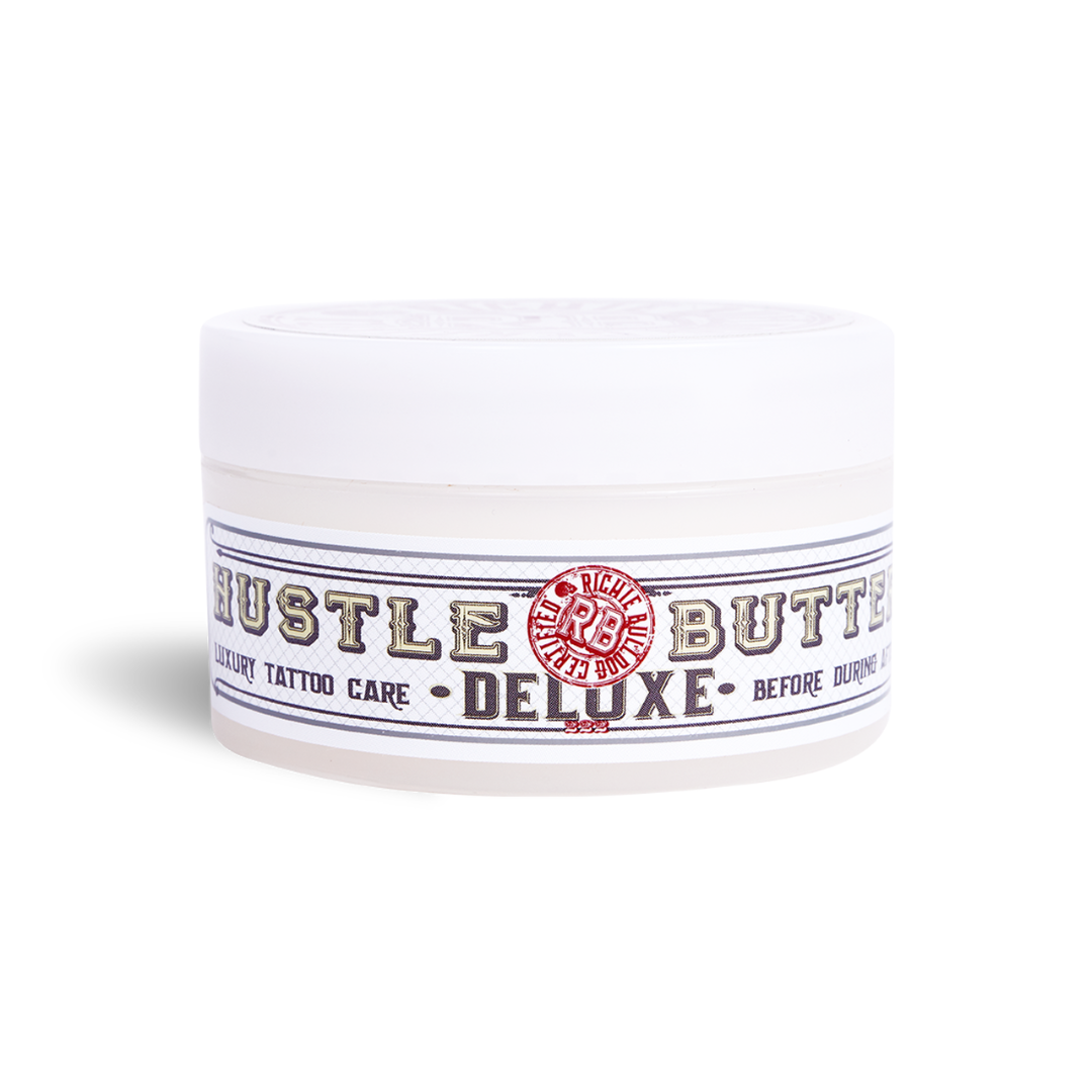Hustle Butter Deluxe Luxury Tattoo Aftercare & Daily Moisturizing Tattoo Cream is as luxurious and rich as it sounds. Developed as a petroleum replacement lubricant used in the tattoo healing process, it is the #1 rated tattoo aftercare product amongst artists and clients with amazing value when tending to swelling & skin inflammation.